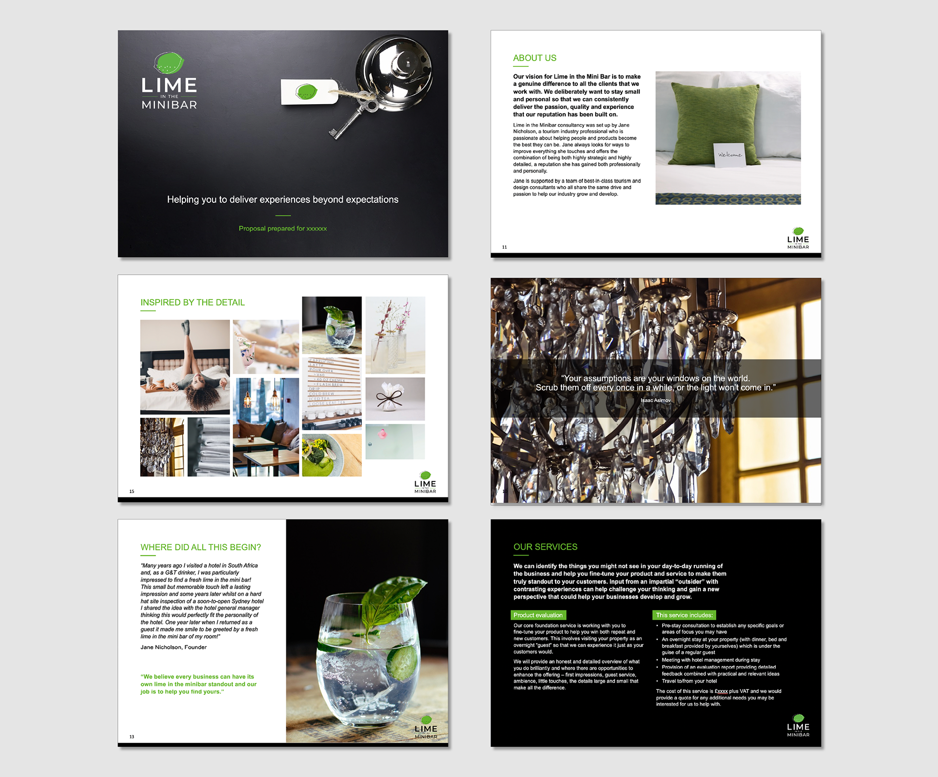 An exciting new business in the hospitality industry approached me requiring a branding for their company. Lime in the Minibar are a boutique consultancy service, who offer expert guidance to help tour operators fine-tune their products and improve their guest experience. The name came about as their founder, Jane Nicholson, a tourism expert, visited a hotel in South Africa and, as a G&T drinker, was particularly impressed to find a fresh lime in the minibar. This small but memorable touch left a lasting impression and some years later while inspecting a soon-to-open Sydney hotel, she shared the idea with the manager. One year later returning as a guest, she was delighted to be greeted by a fresh lime in her minibar! Since then, Jane has enjoyed sharing many inspired ideas with industry colleagues to help fine-tune their product offering. The branding I created for the company uses a simple minimalist font along with a contemporary loosely illustrated lime icon. In addition to the identity – which included a lime segment 'grading' system, I created visual identity guidelines, business cards and Powerpoint templates for creating feedback documents for clients. The website was then created by Sproutworks. View it at: www.limeintheminibar.com.