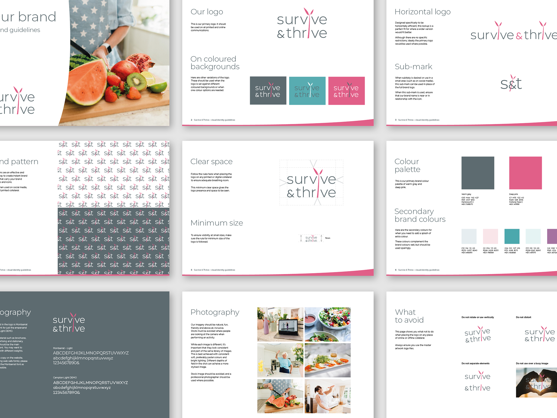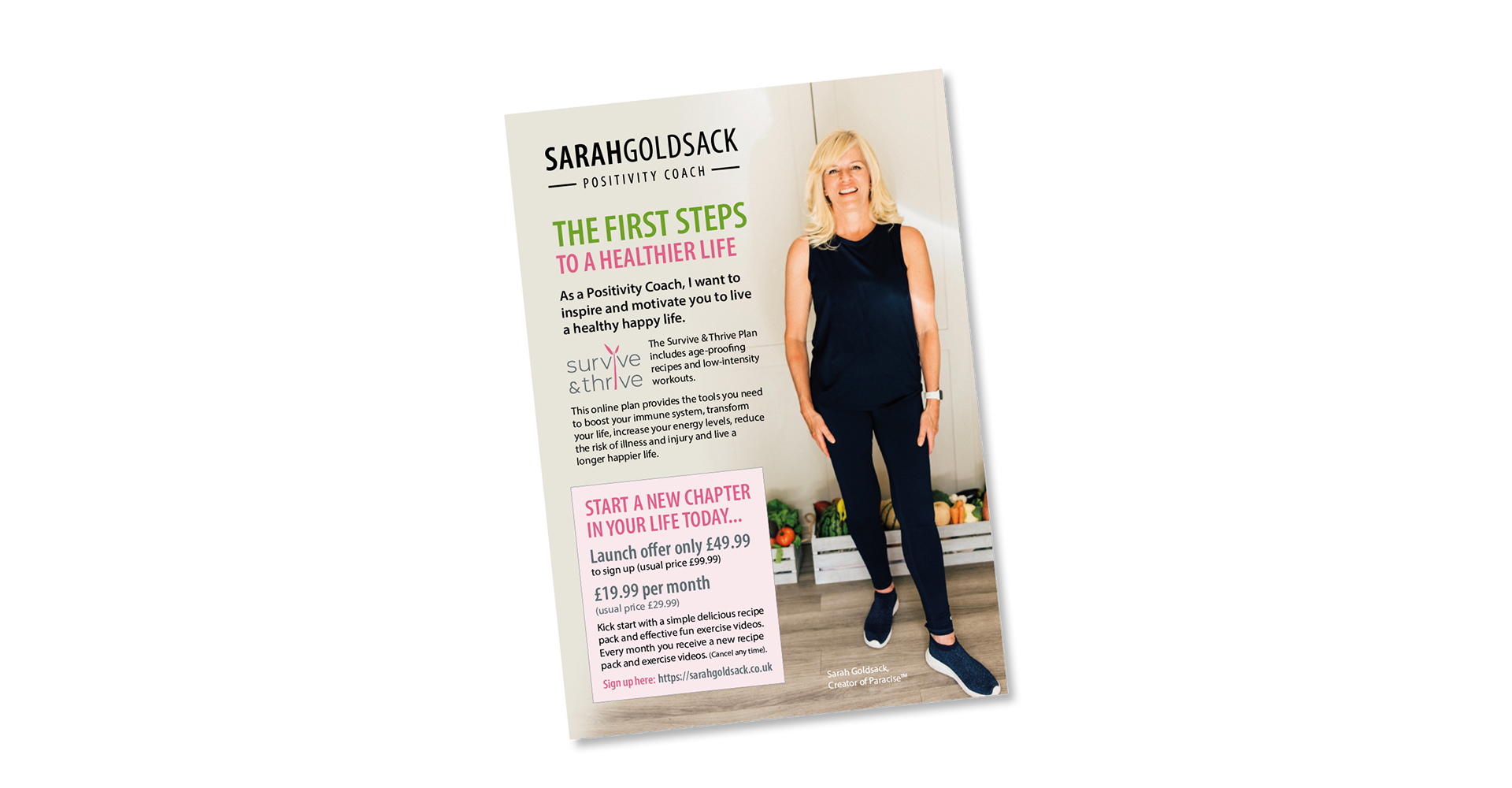Survive & Thrive is an online health and wellbeing programme created by fitness expert Sarah Goldsack, designed to help older adults stay active and healthy through expert advice on nutrition and exercise. Sarah came to me looking for two connected brand identities – one for herself as ‘Sarah Goldsack – Positivity Coach’, and another for her new programme, Survive & Thrive. For Survive & Thrive, I explored ideas around growth, nature, and positive change. The aim was to create a brand that feels uplifting, energetic, and empowering – something that inspires confidence and encourages people to look after their bodies, no matter their age or ability. The identity for ‘Sarah Goldsack – Positivity Coach’ needed to capture Sarah’s warm, optimistic personality while still feeling professional and trustworthy. We kept the colour palette neutral, so the logo could sit comfortably alongside vibrant photography and work well with the different colour schemes planned for future health programmes.